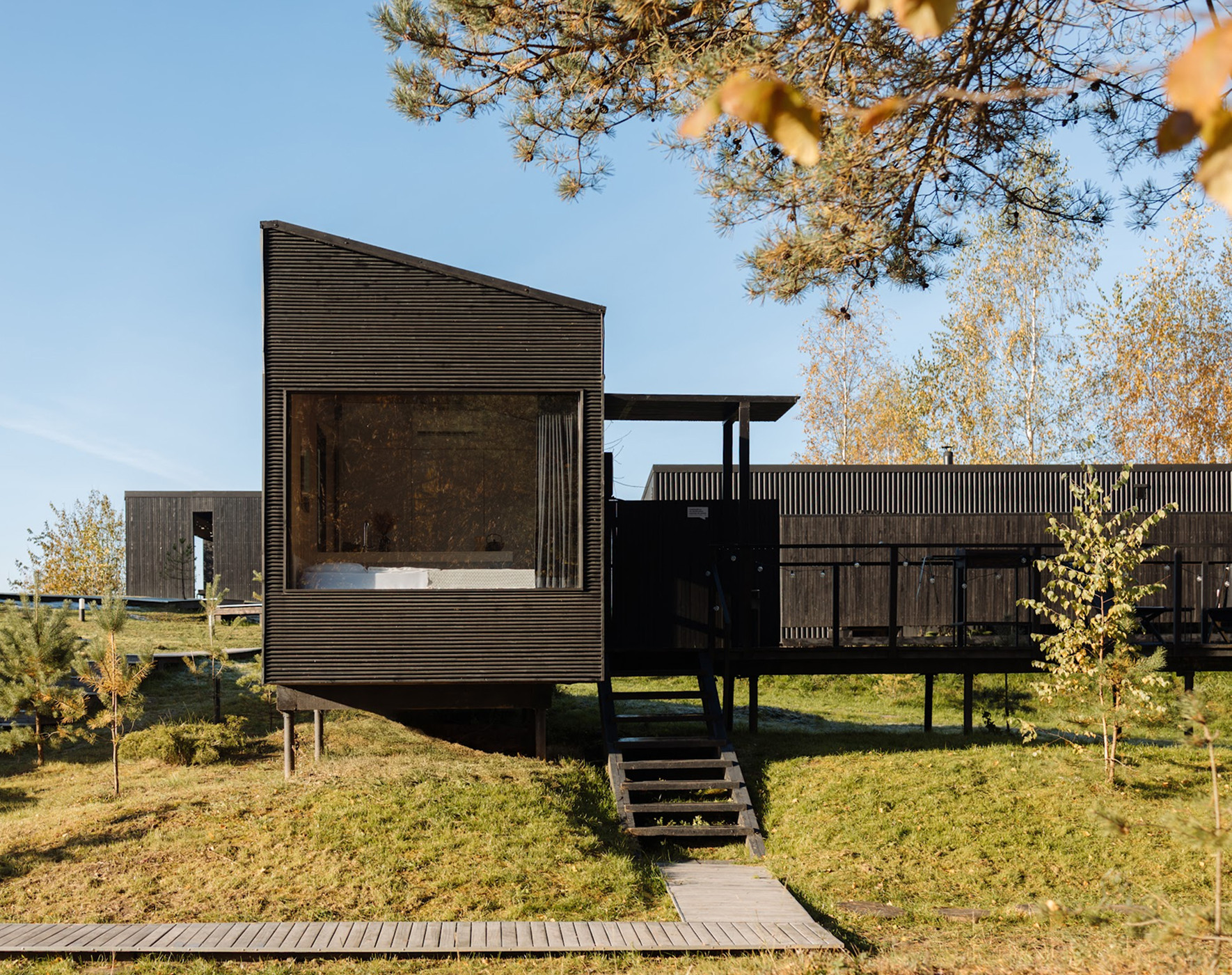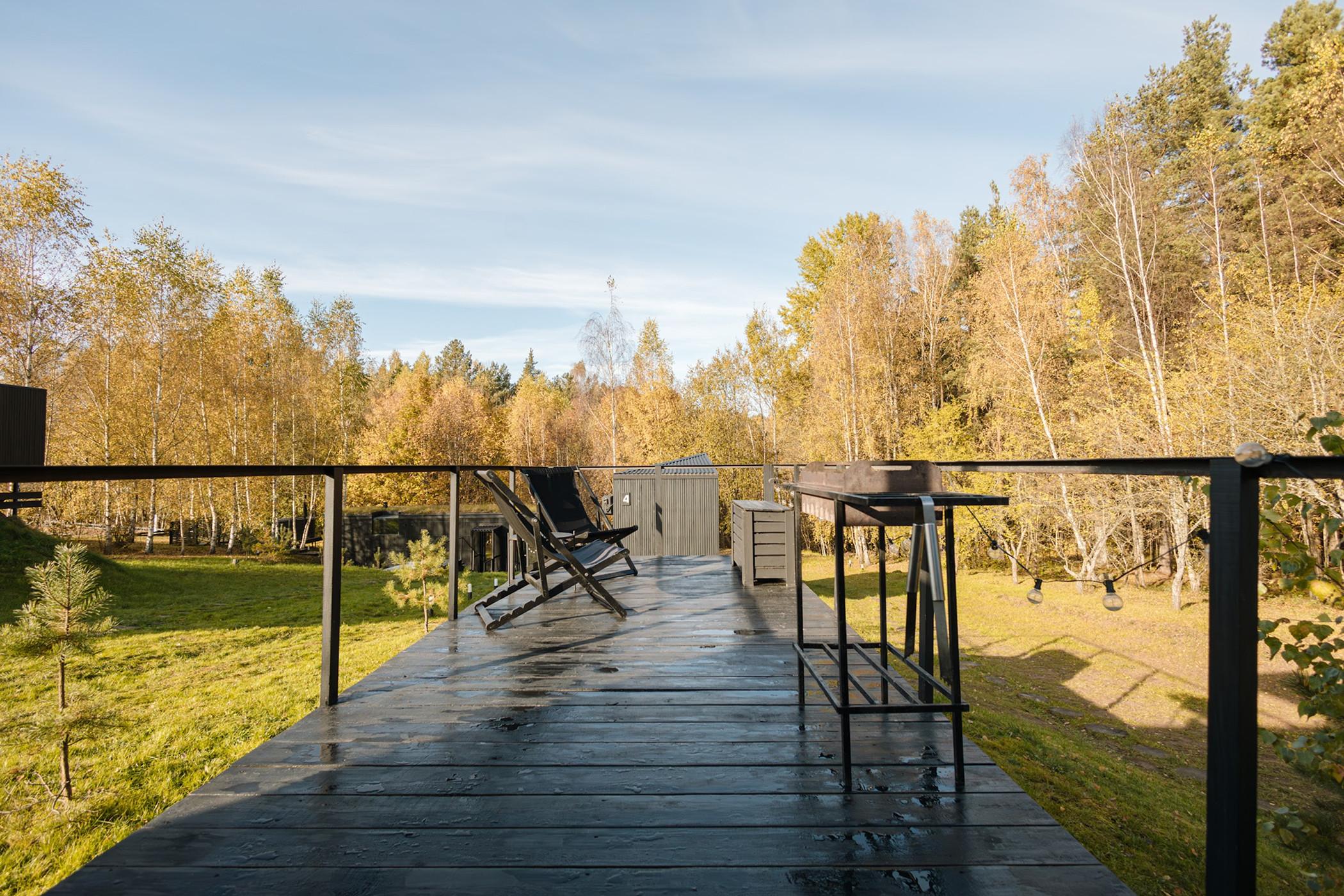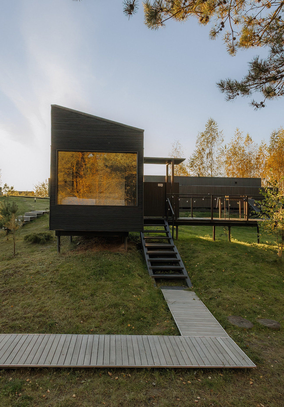 Компактный модульный домик для отдыха 1-2 человек. Домик включает в себя зону отдыха, кухню с обеденным местом, санузел, сауну и террасу открытого типа для барбекю.