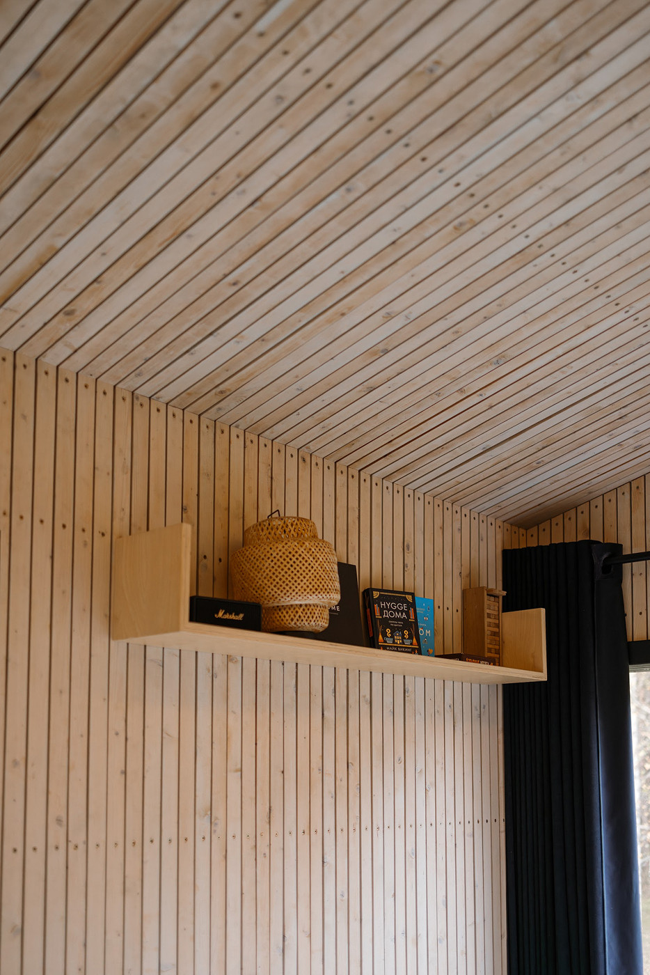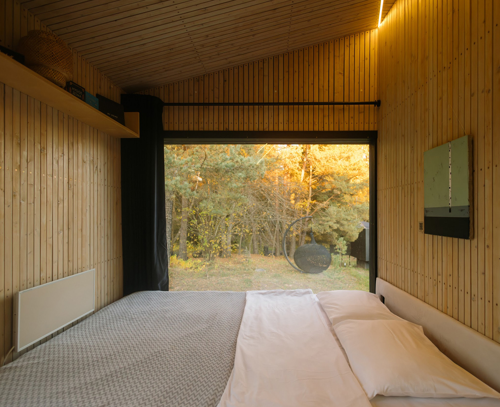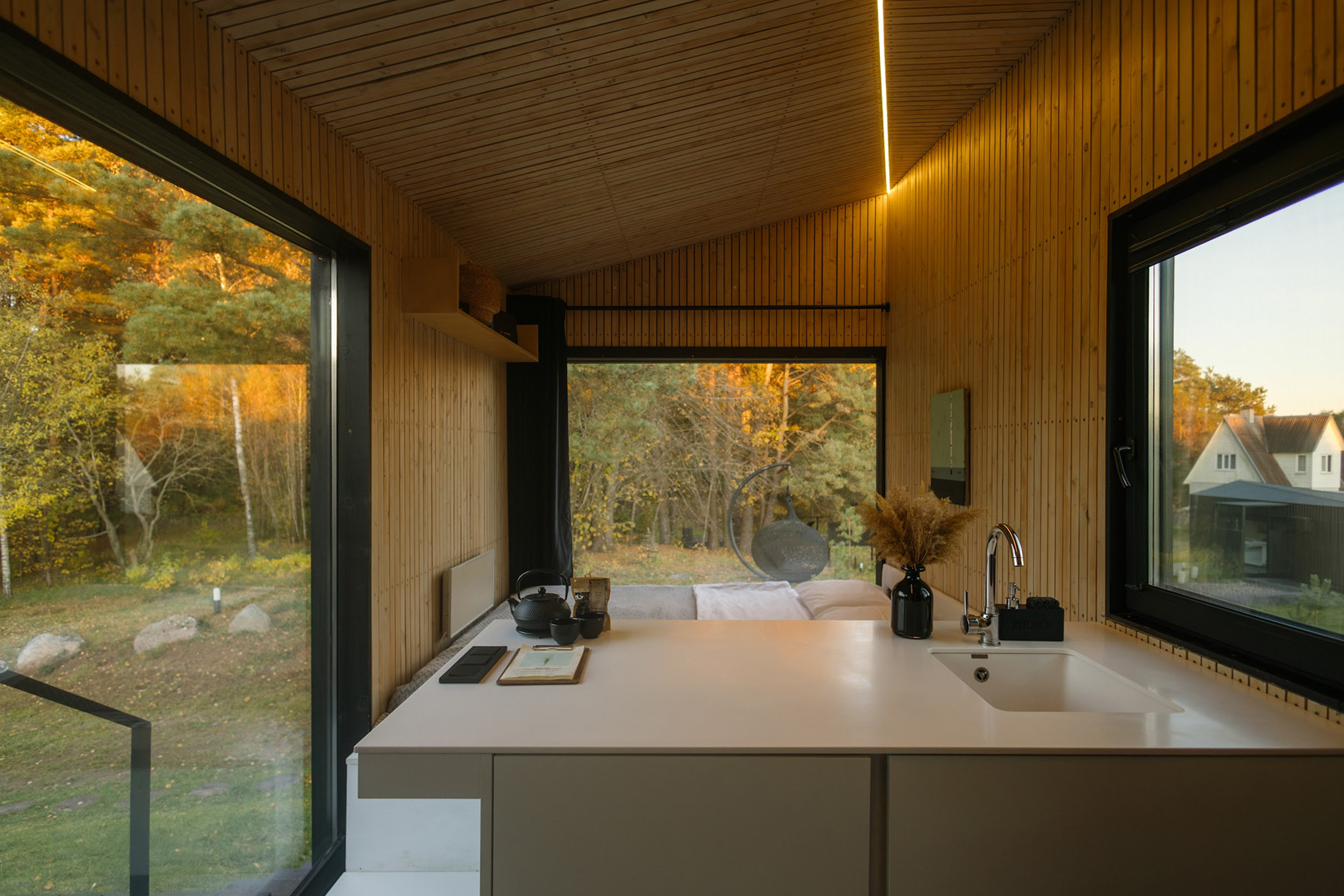 Компактный модульный домик для отдыха 1-2 человек. Домик включает в себя зону отдыха, кухню с обеденным местом, санузел, сауну и террасу открытого типа для барбекю.