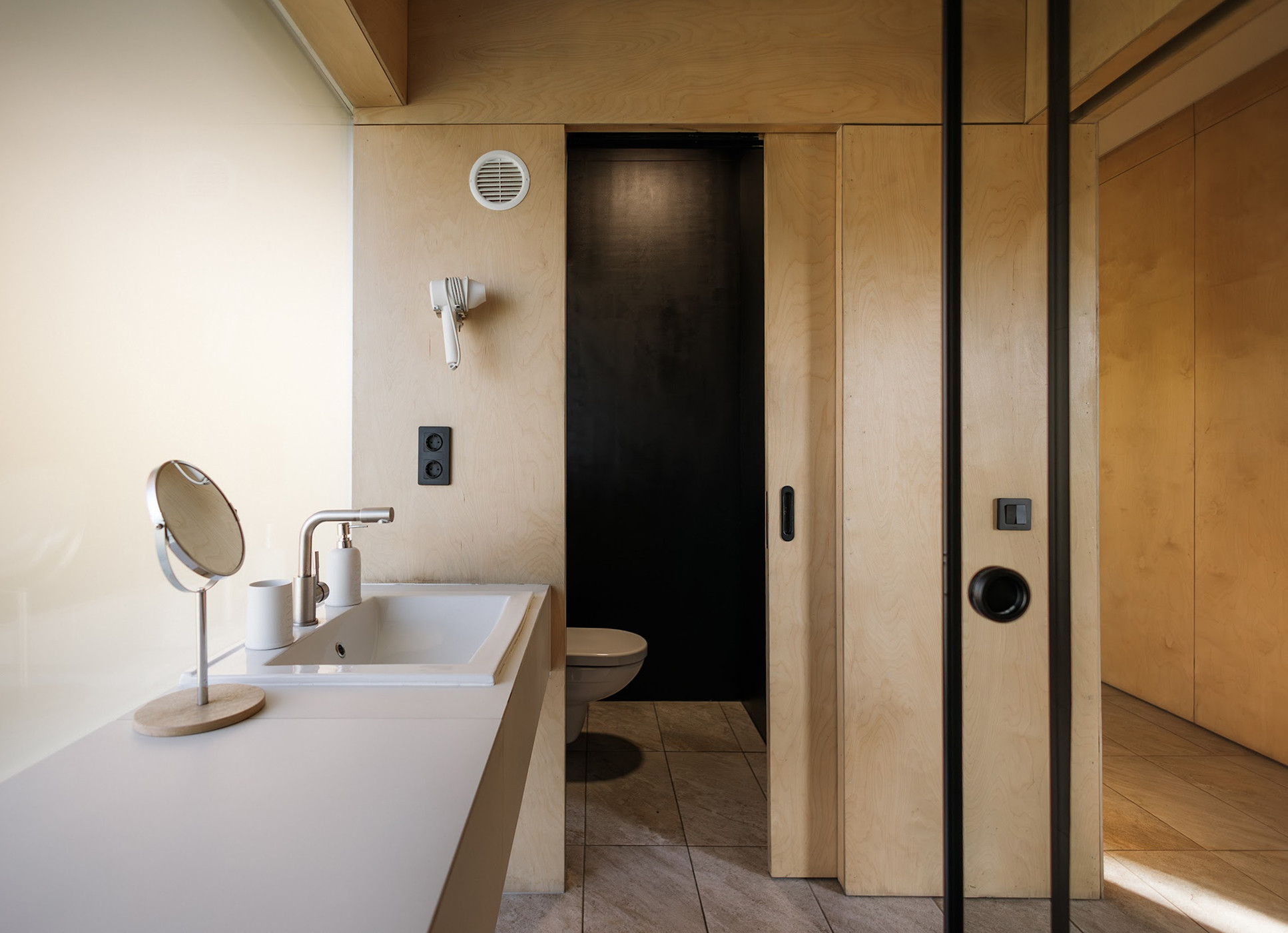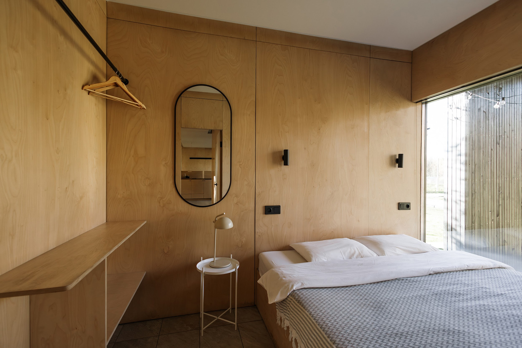 Компактный модульный домик на 4 персоны с камином. Домик включает в себя зону отдыха, отдельную спальню с двуспальной кроватью, гостиную совмещенную с кухней с большим диваном-лежанкой, обеденным местом, санузел, душевую и террасу крытого типа для барбекю. Без сауны